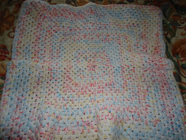 This 25 inches by 25 inches. White with pink, blue and yellow mixed in. perfect for the winter baby or your lap.