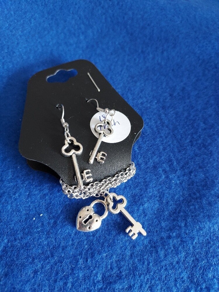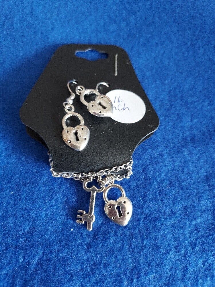 Silver tone, 16 inch chain. Choose your earring type and check out earring sets if you want both kinds of earrings without the added necklace. Sets are limited.